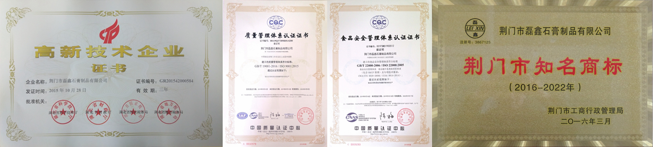 國家高新技術(shù)企業(yè)!湖北省專精特新中小企業(yè)!湖北省支柱產(chǎn)業(yè)細分領(lǐng)域隱形冠軍培育企業(yè)!湖北省守合同重信用企業(yè)!湖北省兩化融合示范企業(yè)!荊門市知名商標(biāo)!中國高純、高白、高亮、超細硫酸鈣(石膏)生產(chǎn)基地!中國取得《食品生產(chǎn)許可證》的食品添加劑硫酸鈣(石膏)供應(yīng)商!中國取得《飼料添加劑生產(chǎn)許可證》和《產(chǎn)品批準(zhǔn)文號》硫酸鈣供應(yīng)商!中國取得《出口飼料生產(chǎn)、加工、存放企業(yè)檢驗檢疫注冊登記證》飼料添加劑硫酸鈣供應(yīng)商!通過ISO9001國際質(zhì)量管理體系認(rèn)證!通過ISO22000國際食品安全管理體系認(rèn)證!通過HALAL國際清真認(rèn)證!通過KOSHER猶太認(rèn)證! 荊門市磊鑫石膏制品有限公司成立于2002年,位于石膏資源富集的湖北省荊門市東寶區(qū)工業(yè)園幸福路,占地27000余平方米,是一家在業(yè)內(nèi)享有盛譽的集石膏、石膏粉和硫酸鈣制品研發(fā)、生產(chǎn)、銷售于一體的高新技術(shù)企業(yè)。公司擁有 “磊鑫”、“杰普生”、“凱氏蘇特”等5個國家注冊商標(biāo),2個發(fā)明專利,18個實用新型專利,50余篇自有技術(shù)應(yīng)用研究,36篇權(quán)威期刊發(fā)表技術(shù)論文。主要產(chǎn)品有:醫(yī)藥級硫酸鈣、食品級硫酸鈣、飼料添加劑硫酸鈣、人造石透明填充粉,凱色粉、涂料及化妝品功能性填料和特級半水纖膏粉、混合石膏粉、模型石膏粉,建筑石膏粉等九大系列50余種產(chǎn)品。公司享有自營進出口權(quán),客戶遍布全世界,是多家公司、集團和世界500強企業(yè)的優(yōu)秀供應(yīng)商!產(chǎn)品遠銷到韓國、日本、俄羅斯、中國臺灣、東南亞、歐美、中東、非洲等國家和地區(qū)。公司緊靠207國道,焦柳鐵路穿境而過,距漢江碼頭50公里,長江沙市港90公里。交通運輸便利,確保及時供貨。“待用戶為上帝誠信為本,視質(zhì)量為生命持之以恒!”是我們的企業(yè)宗旨,與我們合作是您明智的選擇,共謀發(fā)展是我們共同的目標(biāo)!歡迎垂詢,歡迎惠顧! Your Trusted Source For Food-Grade Calcium Sulfate!——做全球更好的食品級硫酸鈣(石膏)供應(yīng)商! ——CGC·磊鑫石膏